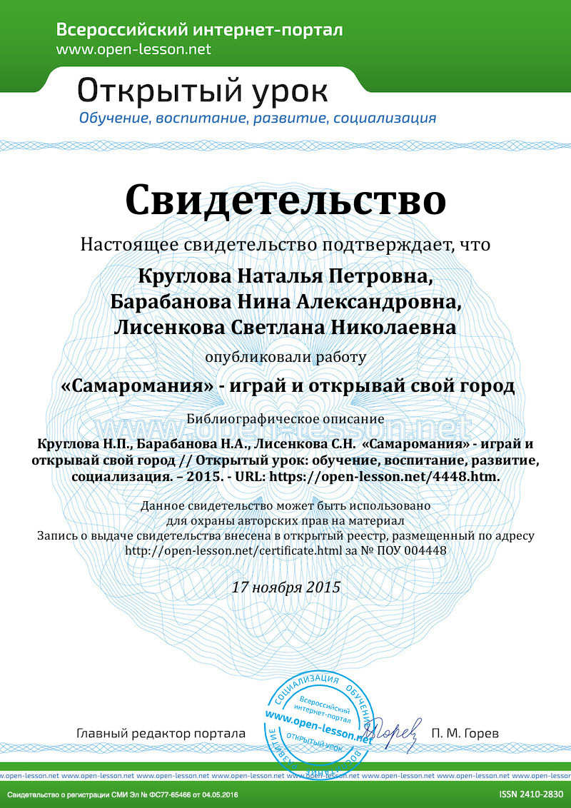 В заключении следует отметить, что проект «Самаромания» - играй и открывай свой город!» был с успехом реализован на практике. Как и было заявлено в плане осуществления проекта, игра прошла апробацию на учащихся Школы юного экскурсовода, которые следующим этапом вышли с ней к ребятам в детскую библиотеку и общеобразовательную школу в рамках инициативы «Дети-детям». Учащиеся ШЮЭ включили краеведческую игру «Самаромания» в «портфель» экскурсовода разработанной ими экскурсии «Жемчужины улицы Фрунзе», заявленной к участию в конкурсе в рамках фестиваля «Новое поколение экскурсоводов».