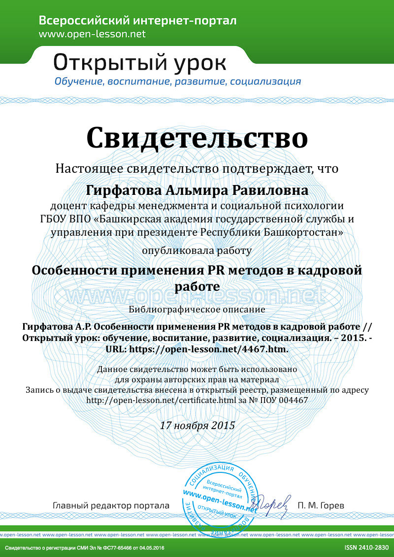 - Методы PR в кадровой работе: учеб.-метод. пособие для подготовки для подготовки бакалавров по направлению 080200.62 «Менеджмент»/ А. Р. Гирфатова. – Уфа : БАГСУ, 2015. – 51 с