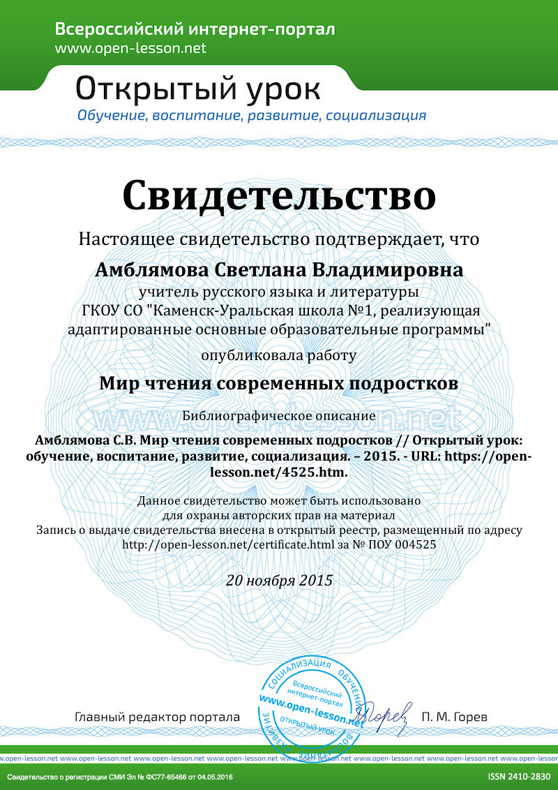 1. Аксарова В.Я., Сафонова Н.К. Читающий подросток в мире взрослых: поиски гармонии. Электронный ресурс http://metodisty narod.ru