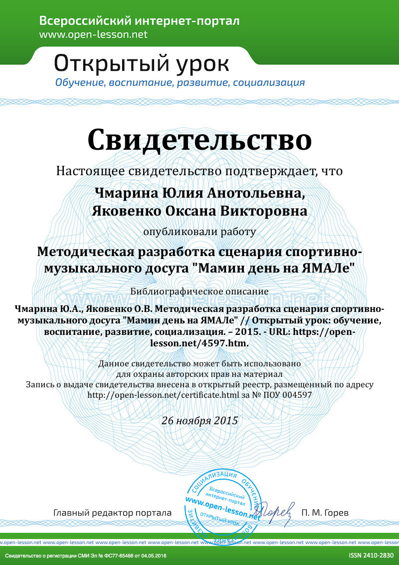Добрый день уважаемые взрослые и дети! Мы собрались сегодня, чтобы поздравить наших дорогих и любимых мам, решили это сделать здесь, в нашем спортивном зале, потому что на ЯМАЛе проходит ещё один праздник -юбилей Ямало-Ненецкого Автономного Округа, нашему краю исполняется 85 лет.