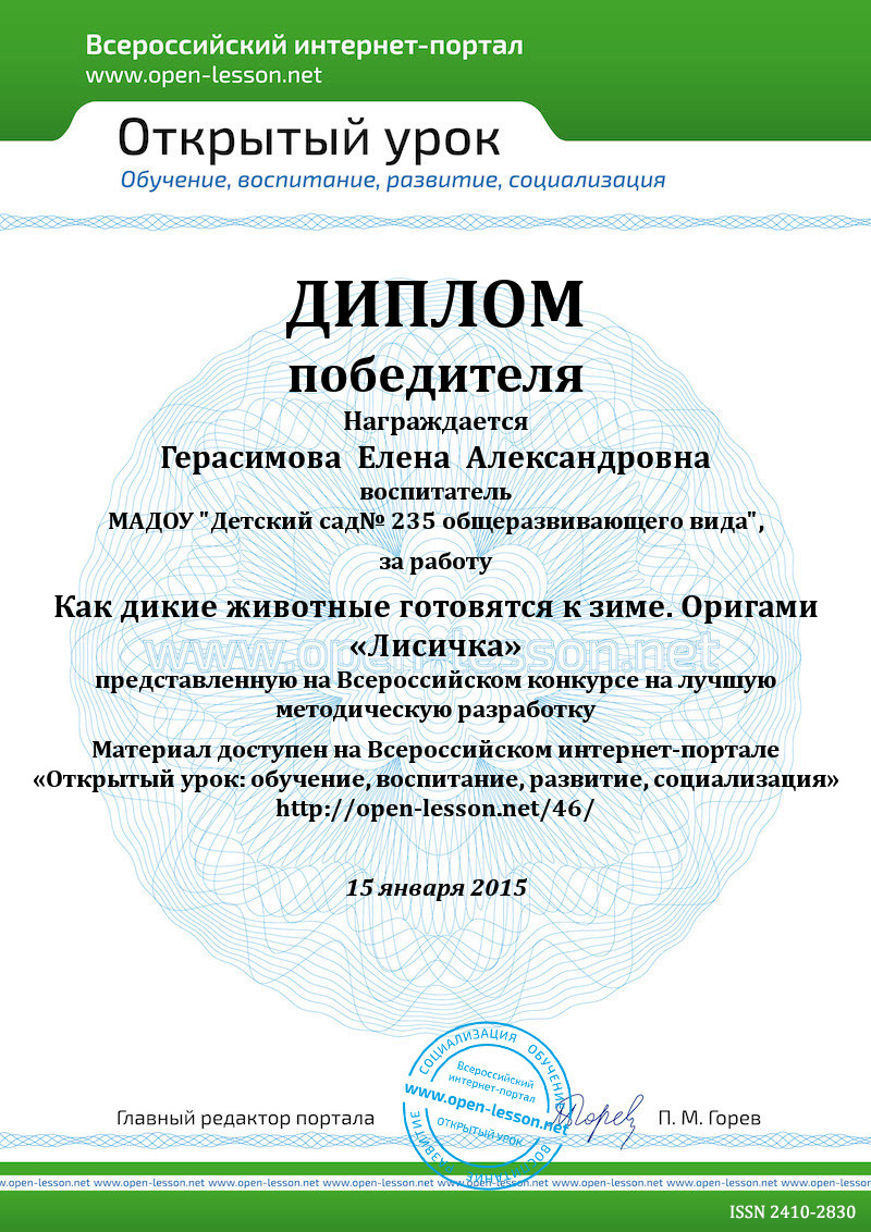 Материалы и оборудование: компьютер, мультимедийный проектор, презентация «Дикие животные», цветная бумага, карандаши, схема складывания оригами «Лисичка».