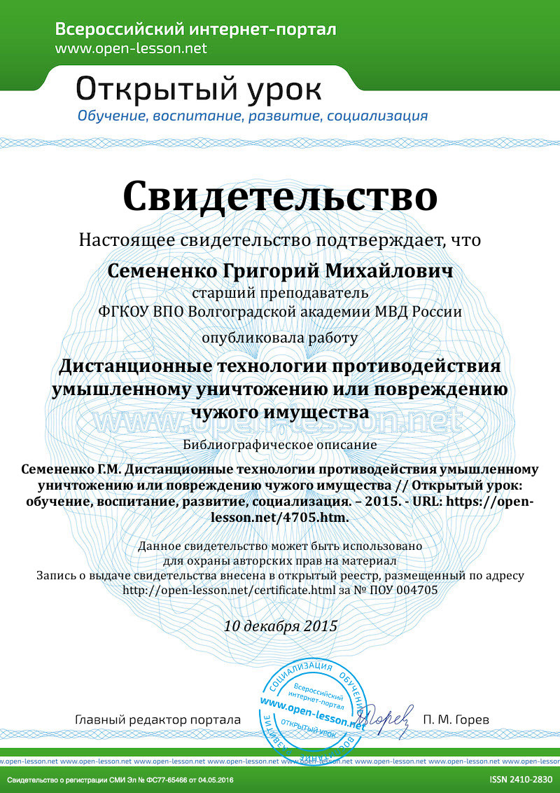 - Семененко Г.М. Проблемы противодействия умышленному уничтожению или повреждению чужого имущества: региональный аспект: монография. Тамбов. 2014 г. С.140-179.