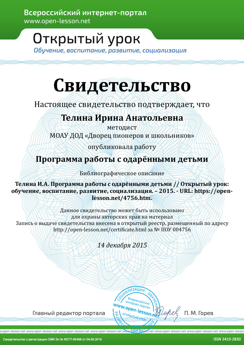 - Апарина, О. Ю. Комплексная программа выявления творческих и интеллектуальных способностей детей / О. Ю. Апарина // Дополнительное образование и воспитание. – 2012. - №6. – С. 11-20.