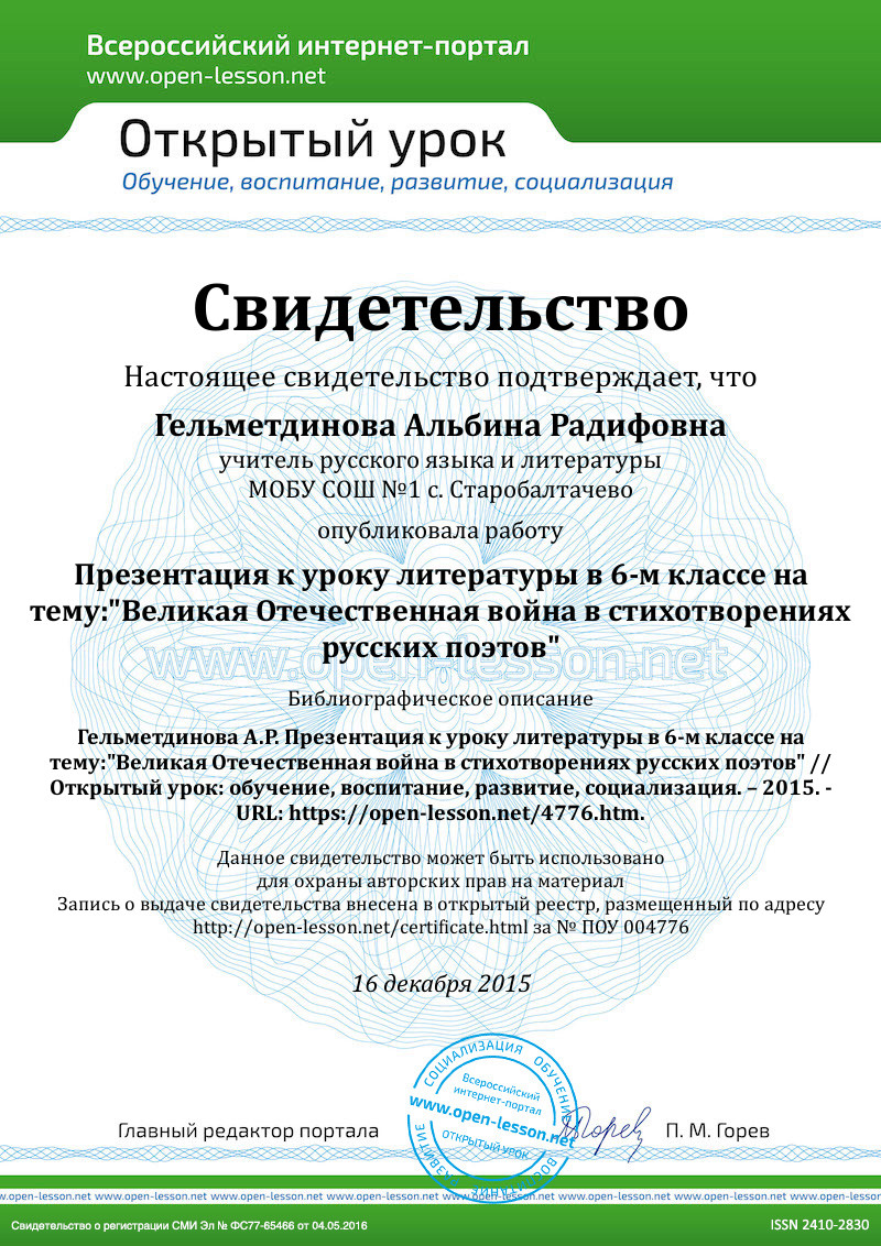 Данный урок, в центре которого является обсуждение стихов о войне, можно приурочить к 9 Мая — Дню Победы в Великой Отечественной войне.