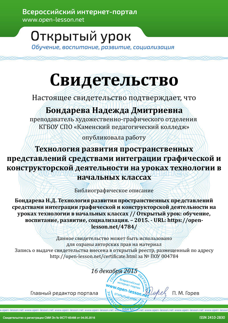 Успешное решение задач по конструированию во многом зависит от усвоения младшими школьниками элементов графической грамоты, формирование которых предполагает организацию труда на подлинно научной основе, на базе широкого применения технической документации, различных графических изображений. Доказана возможность обучения младших школьников элементам графической грамоты. Исследовательская деятельность показала доступность учащимся первого класса изготовления изделий по чертежу, способствующие самостоятельным решениям простейших трудовых конструктивно-технических задач. В процессе использования графических изображений формируются пространственные представления, умения организовывать трудовое задание, планировать работу. Поэтому целесообразно учить младших школьников изготовлению изделий по образцу с применением чертежа, технического рисунка. При этом ведущее значение придается образцу изделия: графические изображения являются средством, поясняющим устройство и конструкцию изделия. Б.Ф. Ломов «Научные основы формирования графических знаний, умений и навыков школьников». М. 1979, ставит в прямую зависимость «формирование системы обобщенных и в то же время специализированных пространственных представлений» от результатов графической деятельности. Она, по свидетельству автора, складывается из наблюдения, измерения и построения.