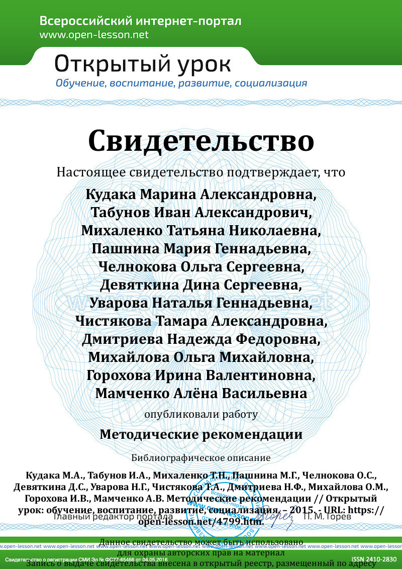 Актуальная задача разработки системного мониторинга сформированности универсальных учебных действий у учащихся школ города с 1 по 5 класс обусловила создание рабочей группы педагогов-психологов, целью работы которой было апробирование комплексов наиболее валидных и надежных методик оценки сформированности личностных и метапредметных умений. В рабочую группу вошли педагоги-психологи различных общеобразовательных учреждений г.Череповца: Т.Н.Михаленко (МБОУ «СОШ №21 с углубленным изучением отдельных предметов»), М.Г.Пашнина (МБОУ «СОШ №10 с углубленным изучением отдельных предметов»), О.С.Челнокова (МБОУ «СОШ №32»), Т.А.Чистякова (МБОУ «СОШ №1»), Н.Г.Уварова (МБОУ «СОШ №28»), Н.Ф.Дмитриева (МБОУ «СОШ №3»), Д.С.Девяткина (МБОУ «СОШ №26 с углубленным изучением отдельных предметов»), О.М.Митрофанова (МБОУ «НОШ №39»), И.В.Волкова (МБОУ «СОШ №40»), А.В.МамченкоМАОУ«Общеобразовательный лицей «АМТЭК».