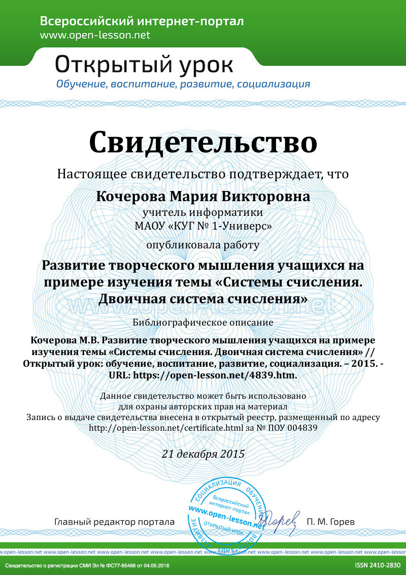 - Зиновкина М. М. Многоуровневое непрерывное креативное образование в школе // Концепт. – 2012. – № 9 (сентябрь). – ART 12116. – 1,0 п. л. – URL: http://www.covenok.ru/koncept/2012/12116.htm. – Гос. рег. Эл № ФС 77- 49965. – ISSN 2304-120X.