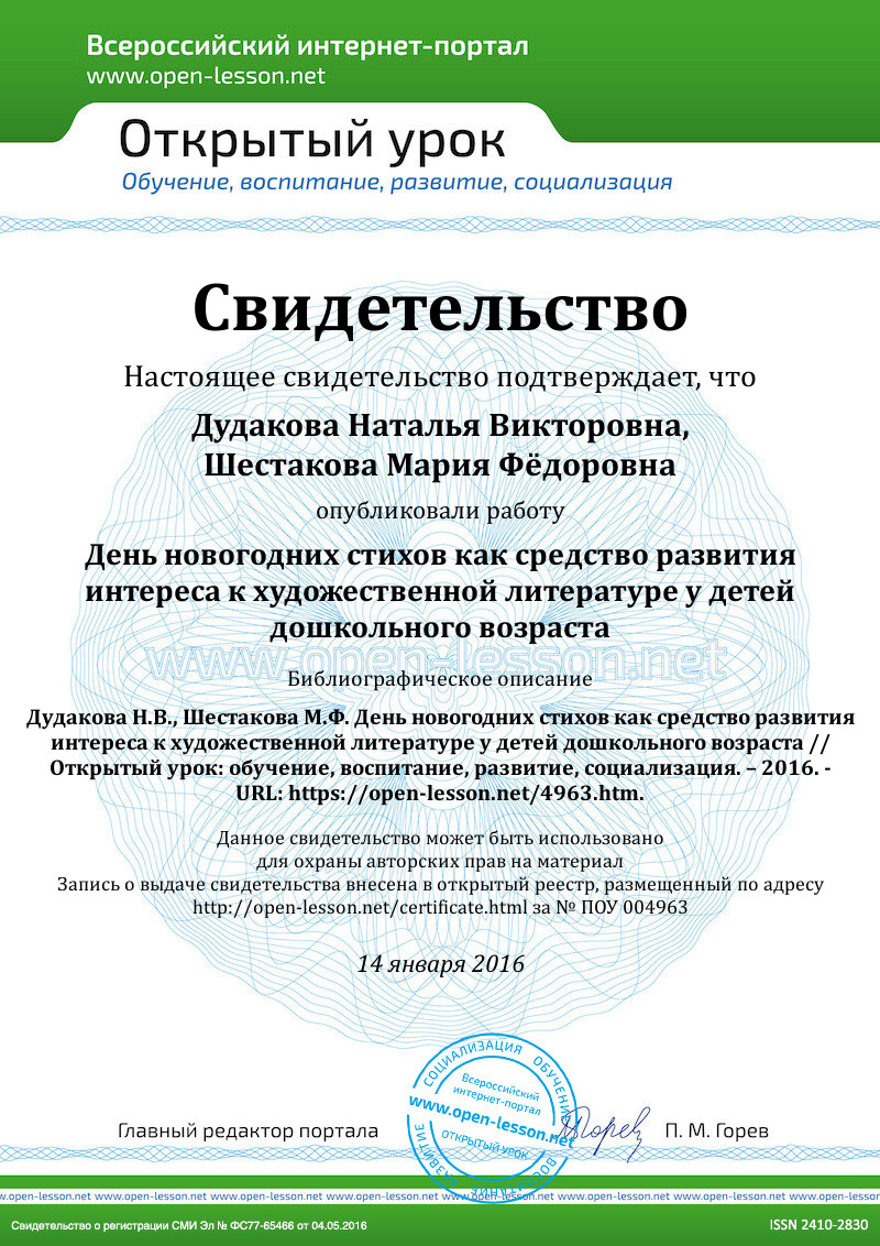 Для того, чтобы все дети прочитали стихи новогодним героям, мы разработали мероприятие «День новогодних стихов». Каждый ребёнок сможет выучить и рассказать стихотворение, получить приз (раскраску, открытку или книжку на тему «Зима»). День новогодних стихов проходит обязательно после основного новогоднего утренника. Опыт показал, что дети с удовольствием и без волнения рассказывают героям стихи. Данное мероприятие адресовано детям 4-5 лет.