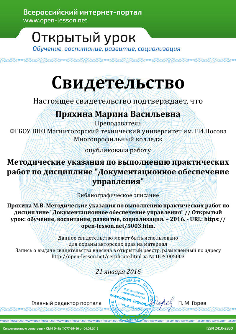 ГОСТ Р 6.30-2003. Унифицированные системы документации. Унифицированная система организационно-распорядительной документации. Требования к оформлению документов. - М.: Госстандарт России, 2003.