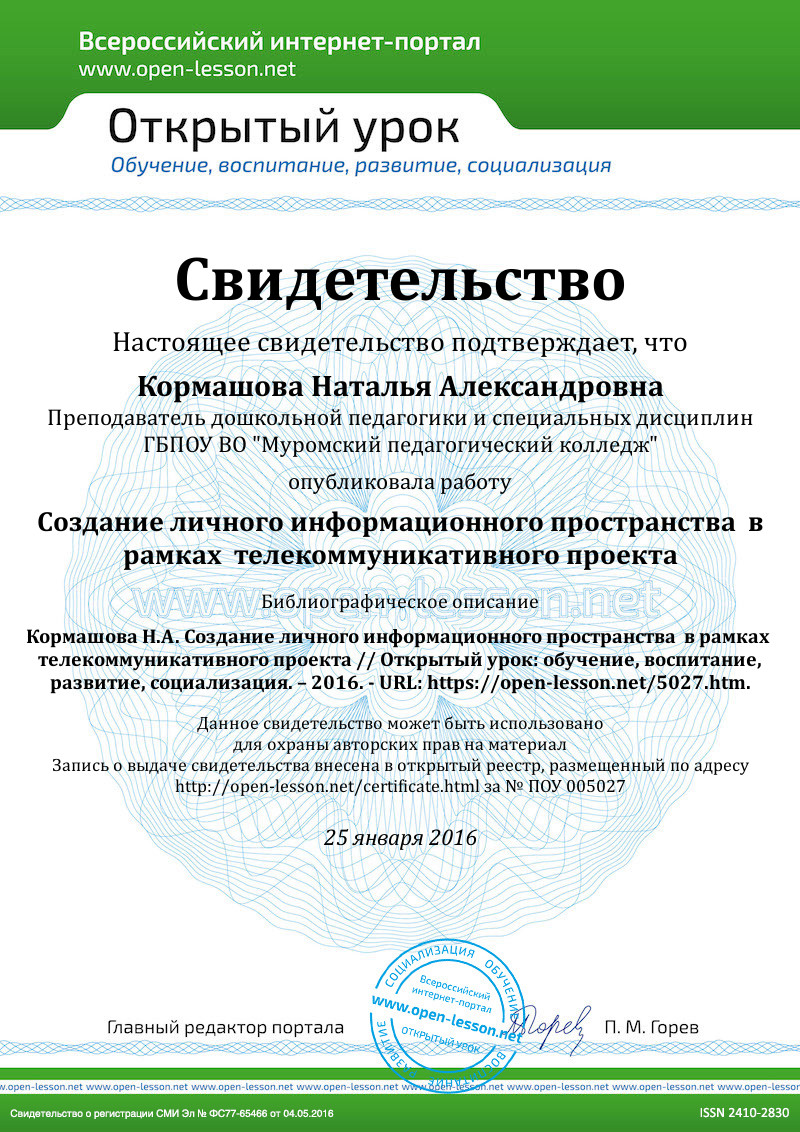 На портале «GOOGLE»:все материалы о ходе реализации проекта, все новости, последовательность этапов проекта, все задания и инструкции к выполнению заданий размещены на портале в соответствующем этапе данного проекта. Все материалы, созданные участниками и руководителями в ходе проекта, размещаются на портале в соответствующем этапе данного проекта. Регистрация участников проходит на портале " GOOGLE". Необходимо зарегистрироваться на портале " GOOGLE " и зайти по адресу: ССЫЛКА НА ТЕЛЕКОММУНИКАЦИОННЫЙ ПРОЕКТ "ПОРТФОЛИО БУДУЩЕГО ВОСПИТАТЕЛЯ" и зарегистрироваться на на портале.
