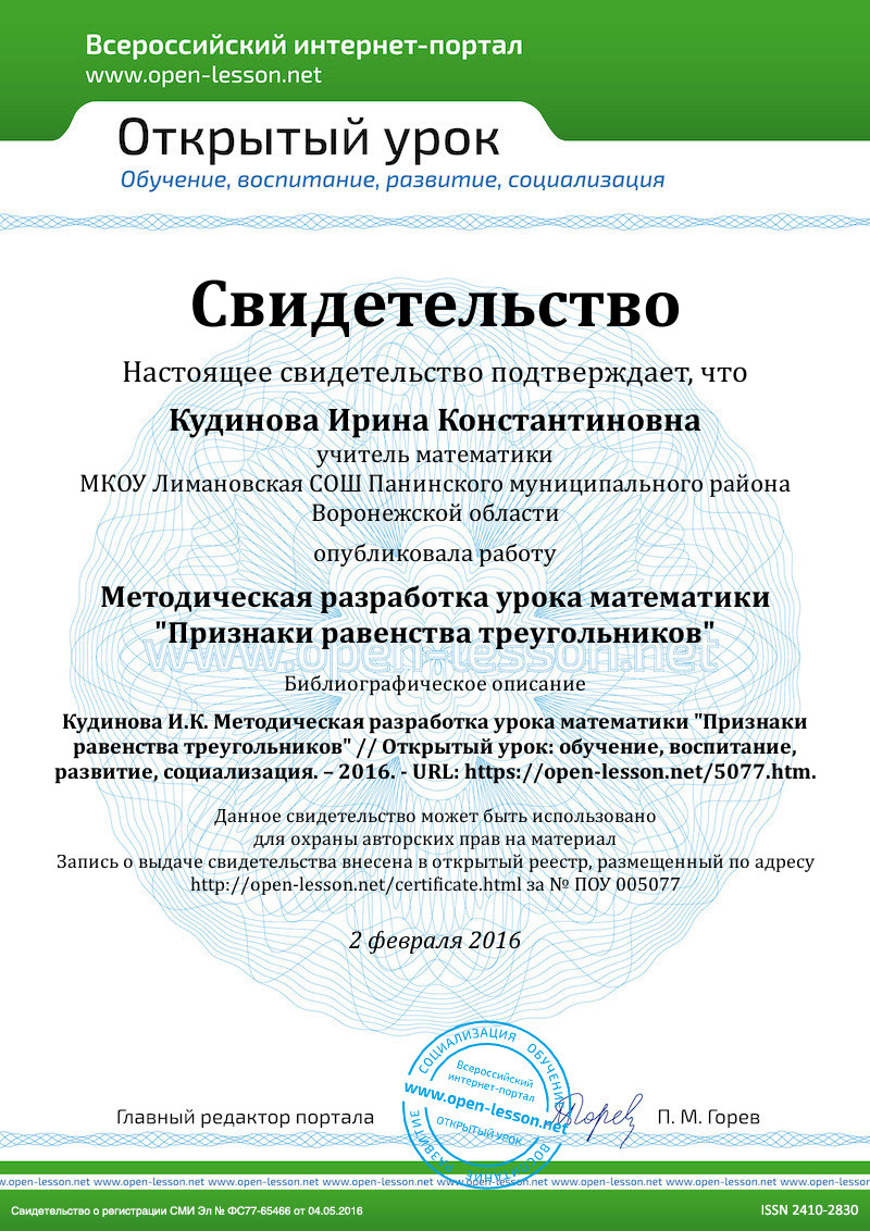 применением определения, свойств треугольника и признаков равенства треугольников.