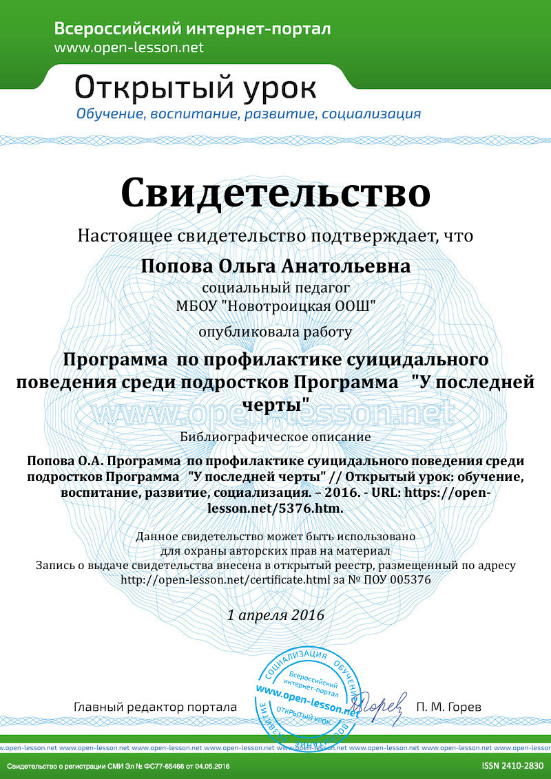 Данная программа рекомендована педагогам школы, социальным педагогам для проведения мероприятий по предупреждению суицидальных попыток среди подростков. В течение 2014-2015 учебного года в школе систематически велась работа по профилактике и предупреждению детского суицида и детей имеющих жизненные проблемы. Реализация плана по профилактике и предупреждению детского суицида и детей, имеющих жизненные проблемы, осуществлялась через совместную работу администрации школы, сотрудников центра ПМПк в с. Бея, учителей, социального педагога и медицинского работника школы. С начала учебного года была сформирована нормативно-правовая база, отдельная папка с нормативной, инструктивно-методической документацией по профилактике суицида среди несовершеннолетних, разработан план мероприятий по профилактике суицида, по которому велась основная работа, собран и обновлен банк данных, который позволил проконтролировать работу с учащимися склонных к суициду и имеющих жизненные проблемы. В банк «группы риска» на начало учебного года вошли 2 учащихся. В течение всего года, дети, имеющие суицидальные проявления, состояли на особом учете у социальной службы школы, администрации, педагогов. Ежедневно осуществлялся контроль за посещаемостью учащихся школы. Систематически проводились рейды по данным семьям, беседы с родителями, индивидуальные консультации с учащимися. В воспитательных планах классных руководителей данное направление в течение учебного года было отражено через организацию внеклассных мероприятий, привлечение учащихся в различные кружки и секции. Мероприятия для детей подсказывали им ответы и пути решения трудных жизненных проблем, конфликтных ситуаций в семье, школе, личной жизни. Большое внимание уделялось практическим занятиям, с оказанием психологической поддержки, по необходимости индивидуальной помощи. Цель занятий – учить детей правильно реагировать и осознавать свои ошибки, анализировать свои поступки и их последствия, учить преодолевать трудности и неприятности жизни, делать выбор и отвечать за последствия перед собой и окружающими, помочь наладить контакты со сверстниками и взрослыми, повышать стрессоустойчивость организма. Родители были познакомлены с информацией о причинах, факторах, динамике суицидального поведения, были даны рекомендации, как заметить надвигающийся суицид, что делать, если у ребенка замечены признаки суицидального поведения. С целью предупреждения кризисных состояний и коррекции психологического неблагополучия учащихся осуществлялась коррекционно-развивающая деятельность: классные часы, тренинги с учащимися, ориентированные на знакомство со своими психологическими особенностями, сильными и слабыми сторонами, способами их коррекции, способами снятия тревожности; тренинги межличностного общения, мастерские ценностных ориентаций. Совместно с социальным педагогом, завучем по УВР в течение учебного года были разработаны рекомендации, памятки и буклеты для родителей: «Как не допустить суицид у подростков?», «Индикаторы суицидального риска», «Дети «группы риска»», «Причины появления кризисных состояний», «Как разговаривать с подростком?», «Подростки и суицид». Осуществлялся контроль за подростками, склонными к суициду в каникулярное время. В течение года проводено 2 