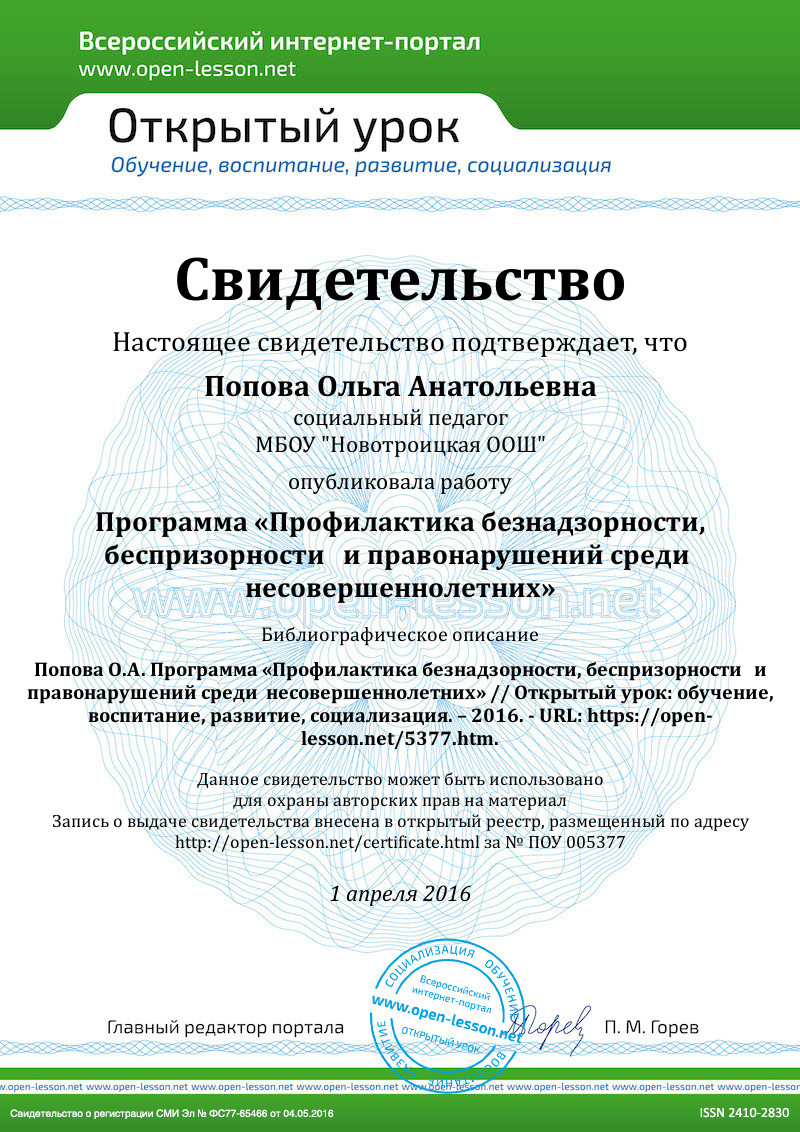 Социальный педагог, Попова Ольга Анатольевна |