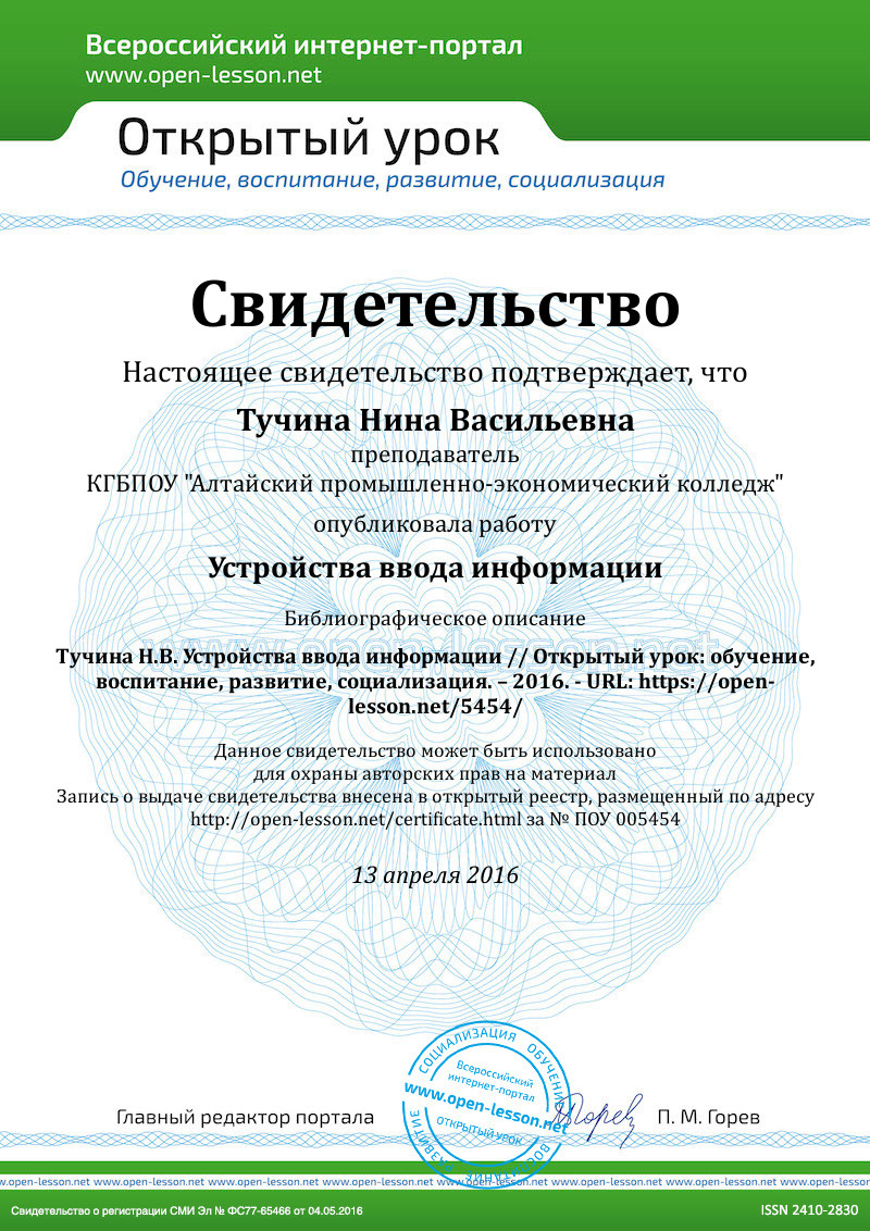 На столах находится материал, который поможет вам составить классификазию устройств ввода информации