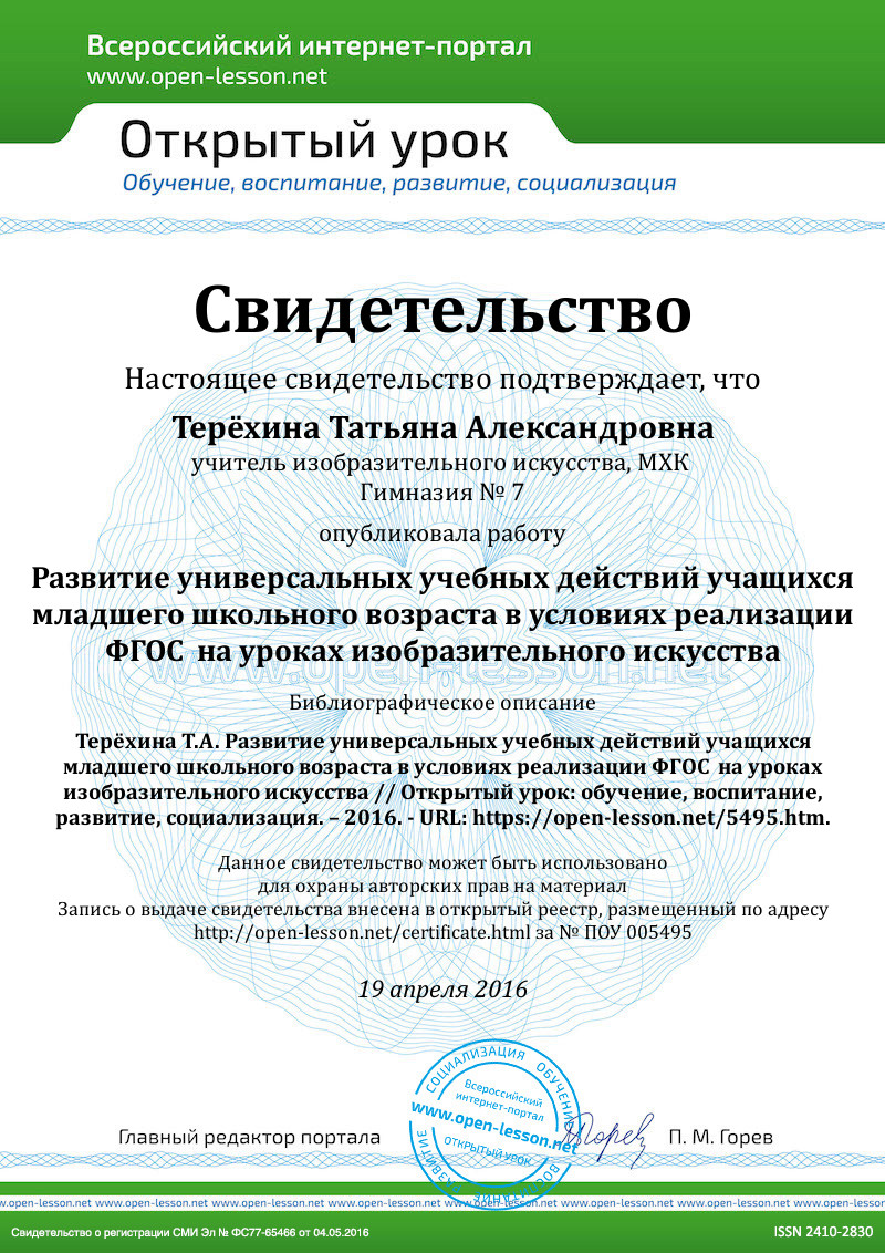 Изменения, происходящие в современной социальной жизни, вызвали необходимость разработки новых подходов к системе обучения и воспитания. Образовательный стандарт нового поколения ставит перед учителем новые цели. Теперь в начальной школе учитель должен научить ребёнка не только читать, писать и считать, но и должен привить универсальные учебные действия, составляющие основу умения учиться [2]. Понятие «универсальные учебные действия» означает умение учиться, т. е. способность субъекта к саморазвитию и самосовершенствованию путем сознательного и активного присвоения нового социального опыта. В более узком (собственно психологическом) значении этот термин можно определить, как совокупность способов действия учащегося (а также связанных с ними навыков учебной работы), обеспечивающих самостоятельное усвоение новых знаний, формирование умений, включая организацию этого процесса. В связи с этим роль учителя, работающего в начальных классах, существенно изменяется в части понимания смысла процесса обучения и воспитания. Теперь учителю необходимо выстраивать процесс обучения не только как процесс усвоения системы знаний, умений и компетенций, составляющих инструментальную основу учебной деятельности учащегося, но и как процесс развития личности, принятия духовно-нравственных, социальных, семейных и других ценностей [1]. Формирование универсальных учебных действий в образовательном процессе осуществляется в контексте усвоения разных учебных дисциплин. Каждый учебный предмет в зависимости от предметного содержания и способов организации учебной деятельности учащихся раскрывает определенные возможности для формирования УУД.