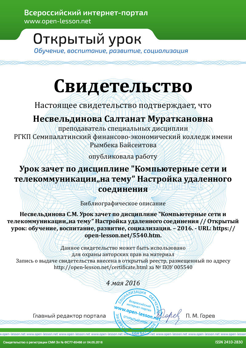 Изучение нового материала (20 мин) Дисциплина: „Компьютерные сети и телекоммуникации„ Раздел 2 Сетевые протоколы Тема курса № 2.2 Адресация в IP-адресах Тема урока: Настройка удаленного соединения. Зачет |