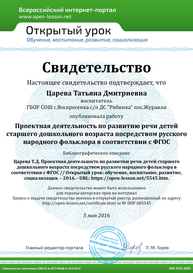 На основе фольклорных произведений составила комплекс закаливающей гимнастики после дневного сна для детей старшего дошкольного возраста, который применяется каждый день для укрепления и сохранения здоровья детей, поддержания интереса к занятиям физическими упражнениям.