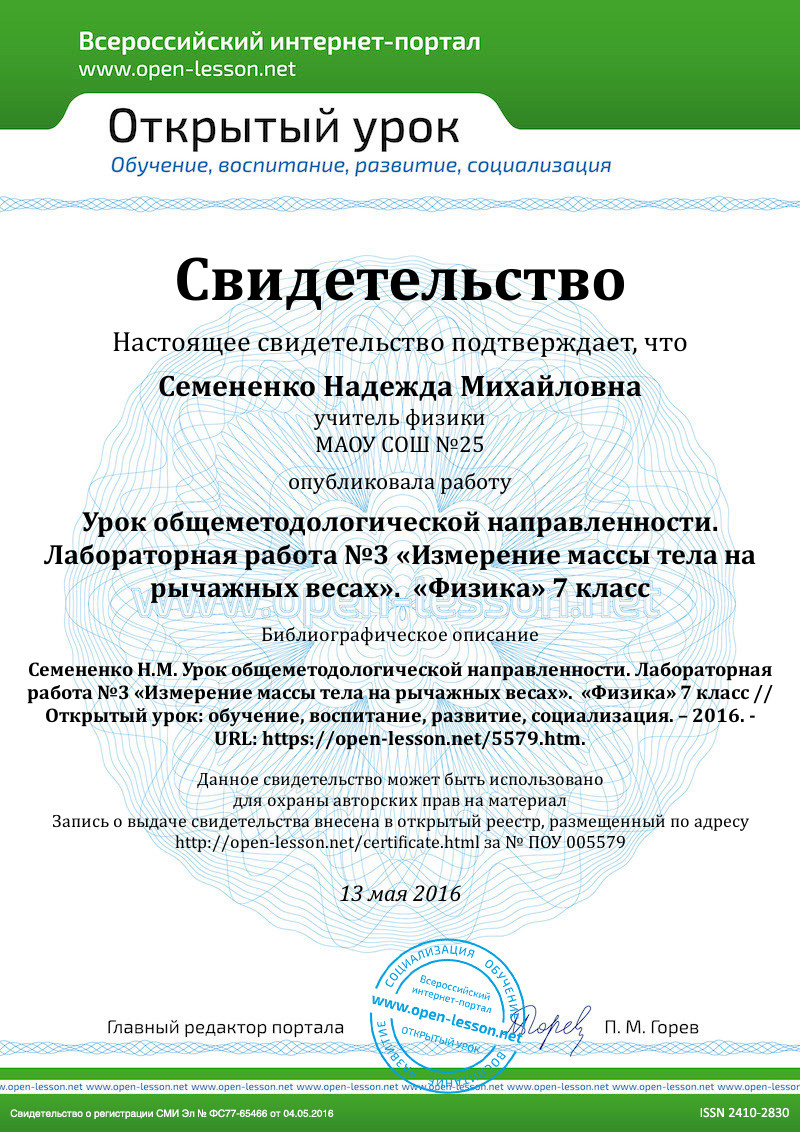 Оценка «4» выставляется при незначительной погрешности измерения и при наличии ответа на вопросы в тетради, вывода.