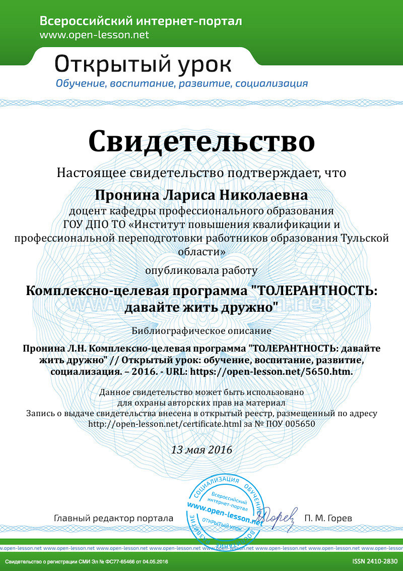 - Обобщение опыта работы по формированию толерантного сознания.