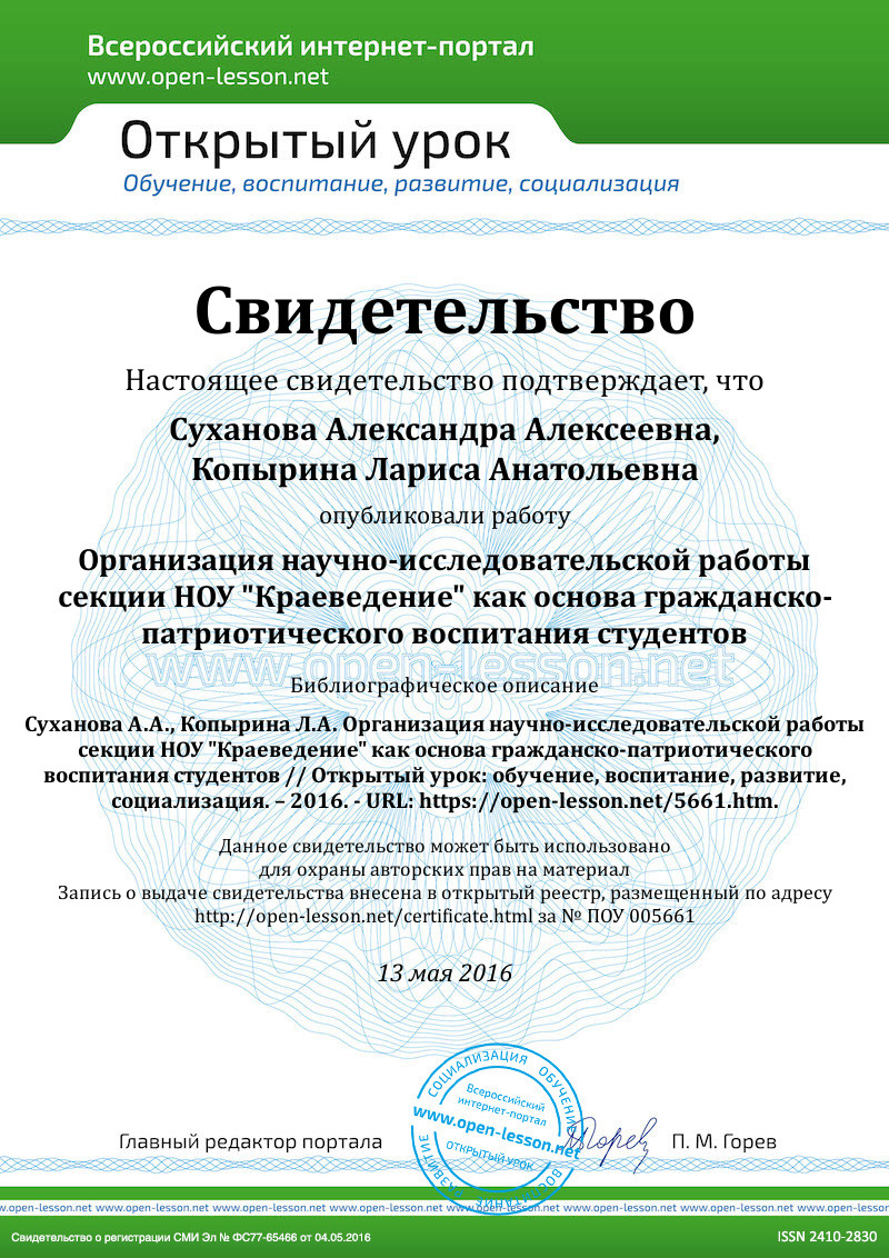 - Копырина, Л.А. Организация гражданского и патриотического воспитания будущих специалистов в секциях НОУ Миасского машиностроительного колледжа / Л.А. Копырина, А.А.Суханова // Успешный педагог – успешный ребенок: Сб. материалов проф. педагог. интернет-конкурсов и научно-практ.интернет-конференций.- Чехов, 2015.- С.11-15