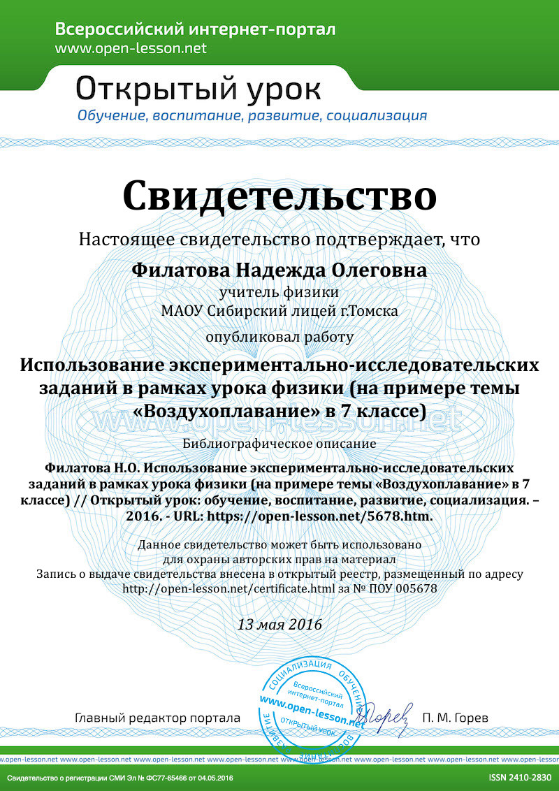 Именно эксперимент с элементами исследования помогает ученику не только лучше понять теорию, но и активно включаться в работу на уроке, выдвигать свои теории для решения проблемы, решать не только вместе с учителем поставленные задачи, но и даже самостоятельно. Эксперимент составляет важную сторону практики. С его помощью наука в состоянии не только объяснить явления материального мира, но и непосредственно овладеть ими. Поэтому эксперимент является одним из главных средств связи науки с жизнью. И экспериментально-исследовательская деятельность на уроках физики является неотъемлемой составляющей при изучении такой сложной науки, как физика.