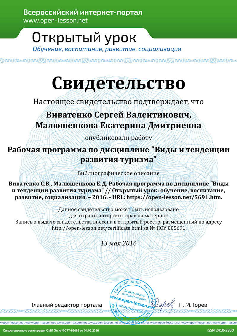 Дисциплина «Виды и тенденции развития туризма» является одной из важнейших в цикле специальных дисциплин и логическим продолжением изучения учебного материала, связанного с основными тенденциями мировой туристской индустрии. В процессе изучения дисциплины на базе анализа современного состояния развития в индустрии туризма рассматриваются вопросы, касающиеся организации различных видов туризма и перспектив их развития на конкретном отраслевом материале.