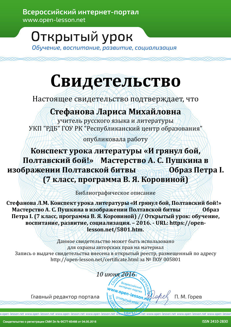 - электронный учебный модуль «А. С. Пушкин «Полтава: http://fcior.edu.ru/card/15822/a-s-pushkin-poltava-chast-2-bazovoe-izuchenie.html Модуль содержит задания для проверки (контроля) знаний по изученной теме. Ход урока:1. Организационный момент. Постановка цели урока. На прошлом уроке мы познакомились с поэмой А. С. Пушкина «Медный всадник». Во вступлении к поэме поэт создаёт величественный образ Петра I-преобразователя. Пушкин интересовался историей России. Особый интерес был у поэта к петровским временам. С начала XVIII века Русь превращается в империю. Петр I вводит много новшеств: развивается промышленность, торговля, армия и флот, культура государства. Начинает расцветать просвещение, создаются школы, издаются книги. И во всём этом была огромная заслуга Петра. Сегодня мы с вами будем говорить о поэме «Полтава». Как и «Медный всадник», эта поэма связана с образом Петра I. 2. Актуализация знаний. Историческая основа поэмы А. С. Пушкина «Полтава». - Какое историческое событие взял А. С. Пушкин за основу поэмы «Полтава»? (Сражение под городом Полтава в 1709 году.) - В чём заключается значение Полтавской битвы? (В 1709 году русские войска разгромили шведов под Полтавой. Эта победа укрепляет авторитет и мощь России в числе других государств. В. Г. Белинский так определил роль этой победы: «Полтавская битва была не просто сражение, замечательное по огромности военных сил… нет, это была битва за существование целого народа, за будущность целого государства».) - А. С. Пушкин тоже Полтавскую битву считал важным событием в царствовании Петра I. В поэме «Полтава» Пушкин выступает не только как поэт, но и как историк. Он задумывается над судьбой Родины. И Полтавскую битву поэт называет «счастливым происшествием, которое избавило страну от опасного врага». Этому историческому событию поэт посвятил поэму «Полтава». 3. Работа с текстом художественного произведения. 1) Чтение отрывка «Полтавский бой», составление цитатного плана фрагмента. Цитатный план: 1. «И битвы поле роковое Гремит, пылает здесь и там». 2. «Толпой любимцев окружённый, Выходит Пётр». 3. «Полки увидели Петра». 4. «Вдруг слабым манием руки На русских двинул он полки». 5. «И грянул бой, Полтавский бой!» 6. «Ура! мы ломим; гнутся шведы». 7. «Пирует Пётр». 2) Беседа по тексту: - Проследите по тексту поэмы последовательность событий Полтавского боя. Какое из них выделяет Пушкин? Почему? - Сопоставьте строки, посвящённые Петру I и Карлу XII. Обратите внимание на внешний облик, поступки и настроение полководцев. Заполните таблицу: