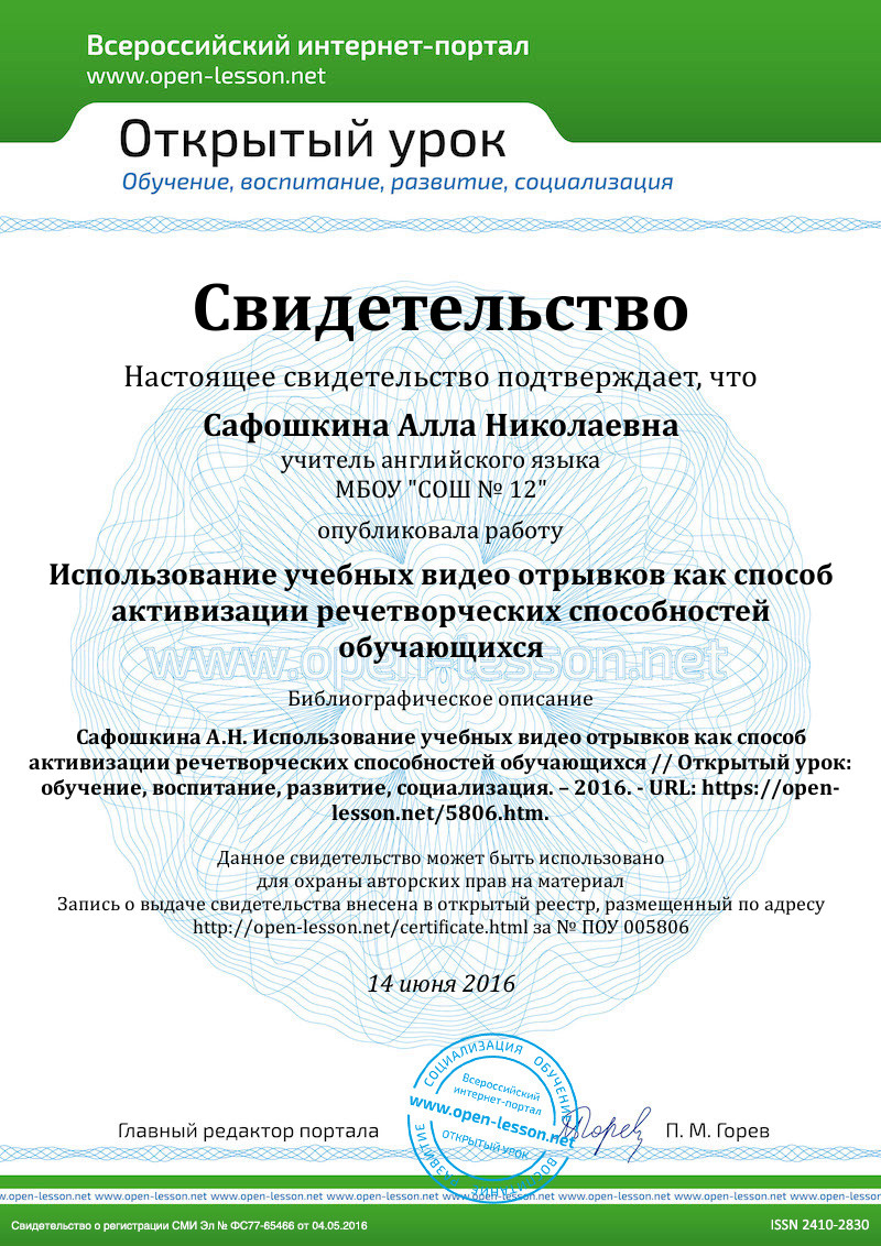 Таким образом, психологические особенности воздействия учебных видеофильмов на учащихся (способность управлять вниманием каждого учащегося и групповой аудитории, влиять на объем долговременной памяти и увеличение прочности запоминания, оказывать эмоциональное воздействие на учащихся и повышать мотивацию обучения) способствуют интенсификации учебного процесса и создают благоприятные условия для формирования коммуникативной (языковой и социокультурной) компетенции школьников.