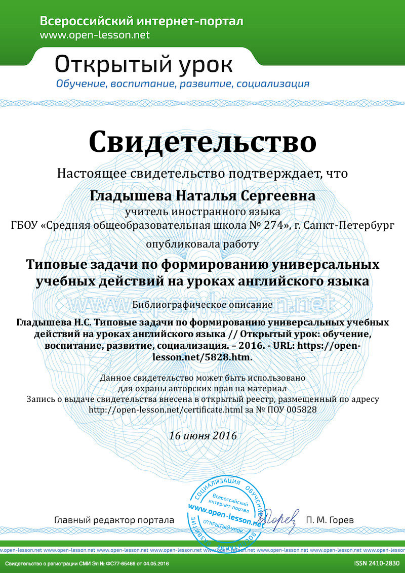 Важнейшей задачей современной системы образования является формирование совокупности универсальных учебных действий (УУД), обеспечивающих компетенцию «научить учиться», а не только освоение обучающимися конкретных предметных знаний и навыков в рамках отдельных дисциплин. УУД – саморазвитие и самосовершенствование путем сознательного и активного присвоения нового социального опыта. У каждого предмета своя специфика. Специфика английского языка заключается в том, что ведущим компонентом содержания обучения английскому языку являются не основы наук, а способы деятельности – обучение различным видам речевой деятельности: говорению, аудированию, чтению, письму – обуславливает необходимость формирования коммуникативных компетентностей через последовательное развитие универсальных учебных действий [2].