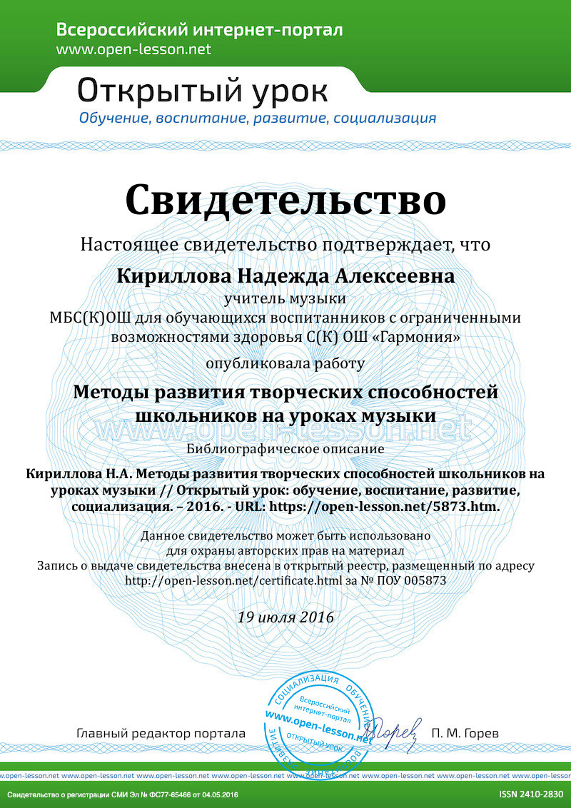 Заключение. В этой статье приведено всего несколько примеров, но можно увидеть, какой потенциал для творческого развития всё это может дать на уроках. Важно только правильно выстроить процесс преподнесения материала, вести его по пути исследования художественного мышления композитора. И когда учащиеся поймут, что это логика человеческого мышления вообще, тогда им станут понятны шедевры и ценности культуры. Мы будем вместе идти к поставленной цели, а значит, заниматься подлинным творчеством.
