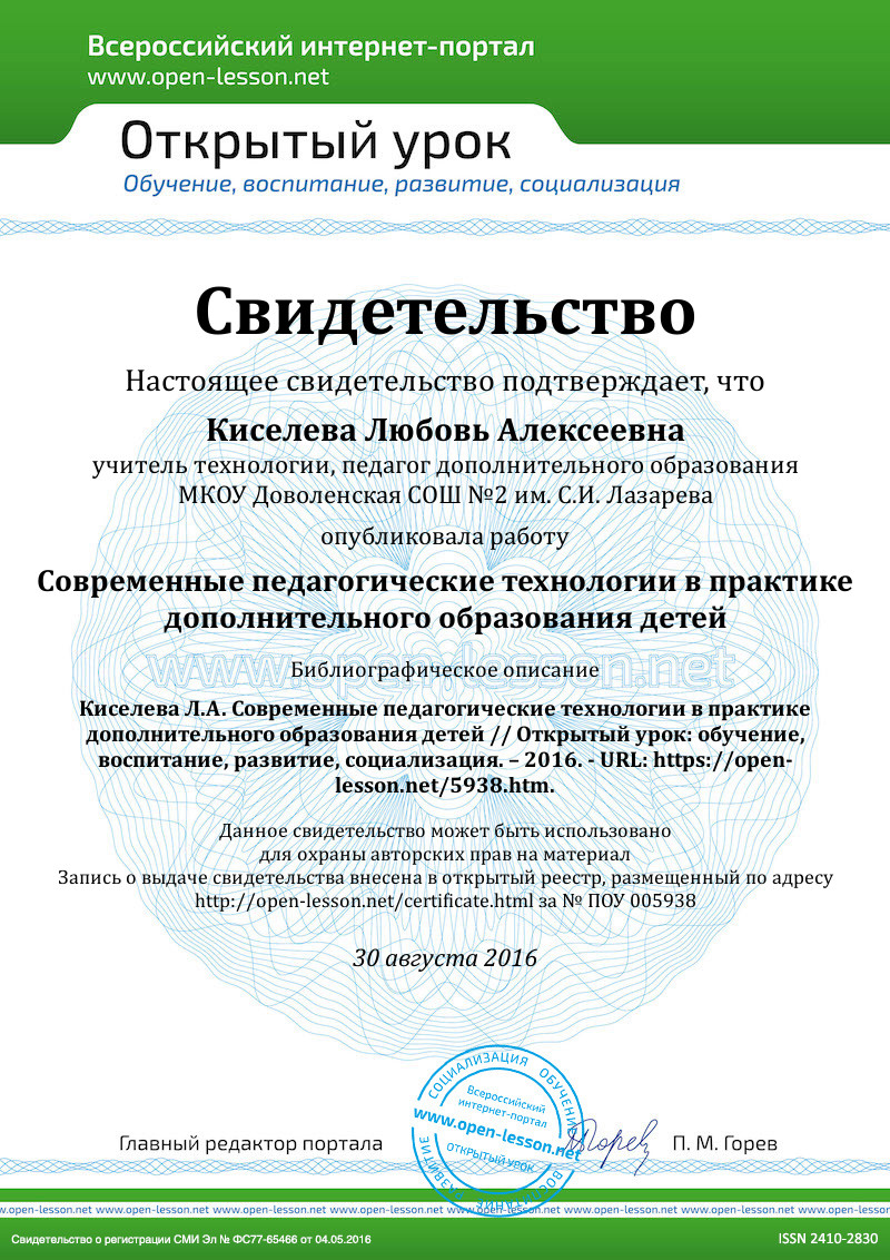 - Современные педагогические технологии в дополнительном образовании (нормативно-методическая статья) // Внешкольник. – 1999. - № 7-8. – С. 37.