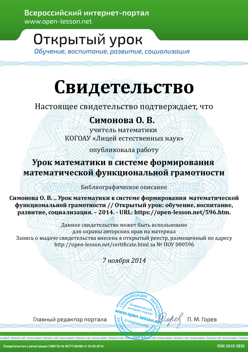- Cимонова О. В. Формирование функциональной грамотности при обучении математике в 5–6-х классах общеобразовательной школы // Вестник Вятского государственного гуманитарного университета – 2010. – № 3. – С. 147–153.