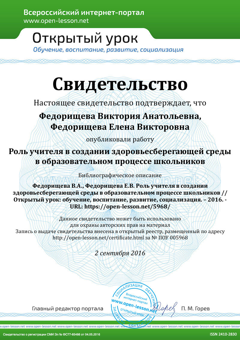 Аннотация на русском языке: В иерархии ценностей учащихся различных ступеней обучения здоровье занимает одно из главных положений. Вместе с тем, учащиеся не имеют твердой жизненной установки на ведение здорового образа жизни. В разрешении противоречия между интуитивным пониманием значения здоровья в обеспечении жизнедеятельности и реальным отношением к нему роль учителя становится определяющей.
