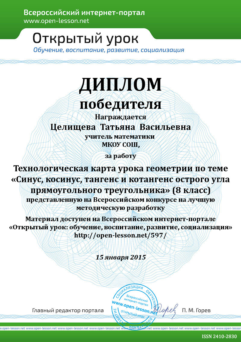 Устанавливает осознанность восприятия учебного материала. Рассматривается решение типовых задач (слайды 12–14). Предлагает учащимся вспомнить проблему и для своего треугольника (лестница, прислонённая к дереву) определить острый угол, записать для него тригонометрические функции. |
