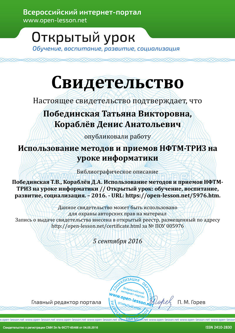 - Утёмов В. В., Зиновкина М. М. Структура креативного урока по развитию творческой личности учащихся в педагогической системе НФТМ-ТРИЗ // Современные научные исследования. Выпуск 1. – Концепт.–2013.