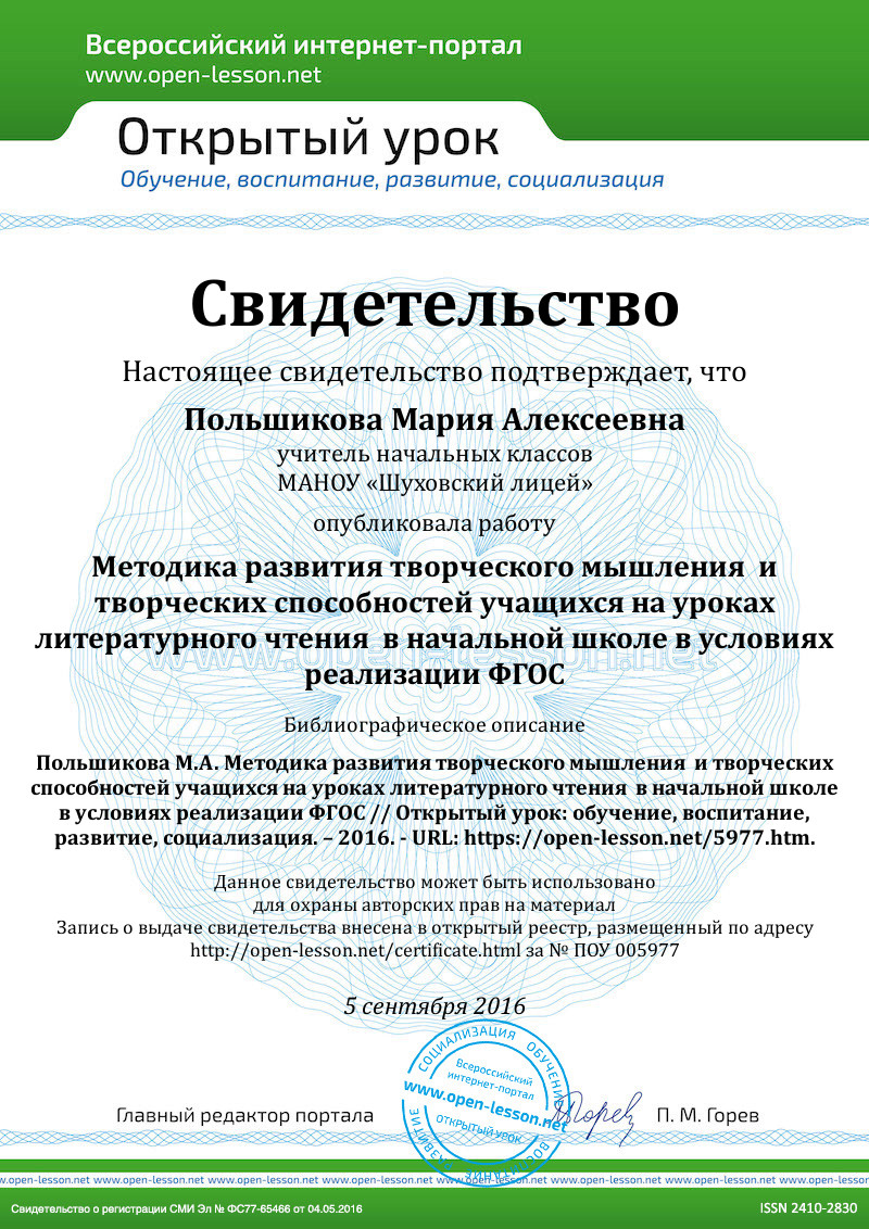 Я считаю, что не только с внедрением ФГОС второго поколения проблема творческого мышления актуальна. Педагог, который приходит в школу не только отвести урок, а дать как можно больше детям и учиться вместе с ними, а также развивать в них всё самое лучшее, всегда работал для развития ребёнка. Сейчас это связано с потребностью общества в неординарной творческой личности. Происходящий в последнее время рост объема информации требует изменения подходов к содержанию и условиям образовательной деятельности, развивающей интеллект и способности школьников [1].