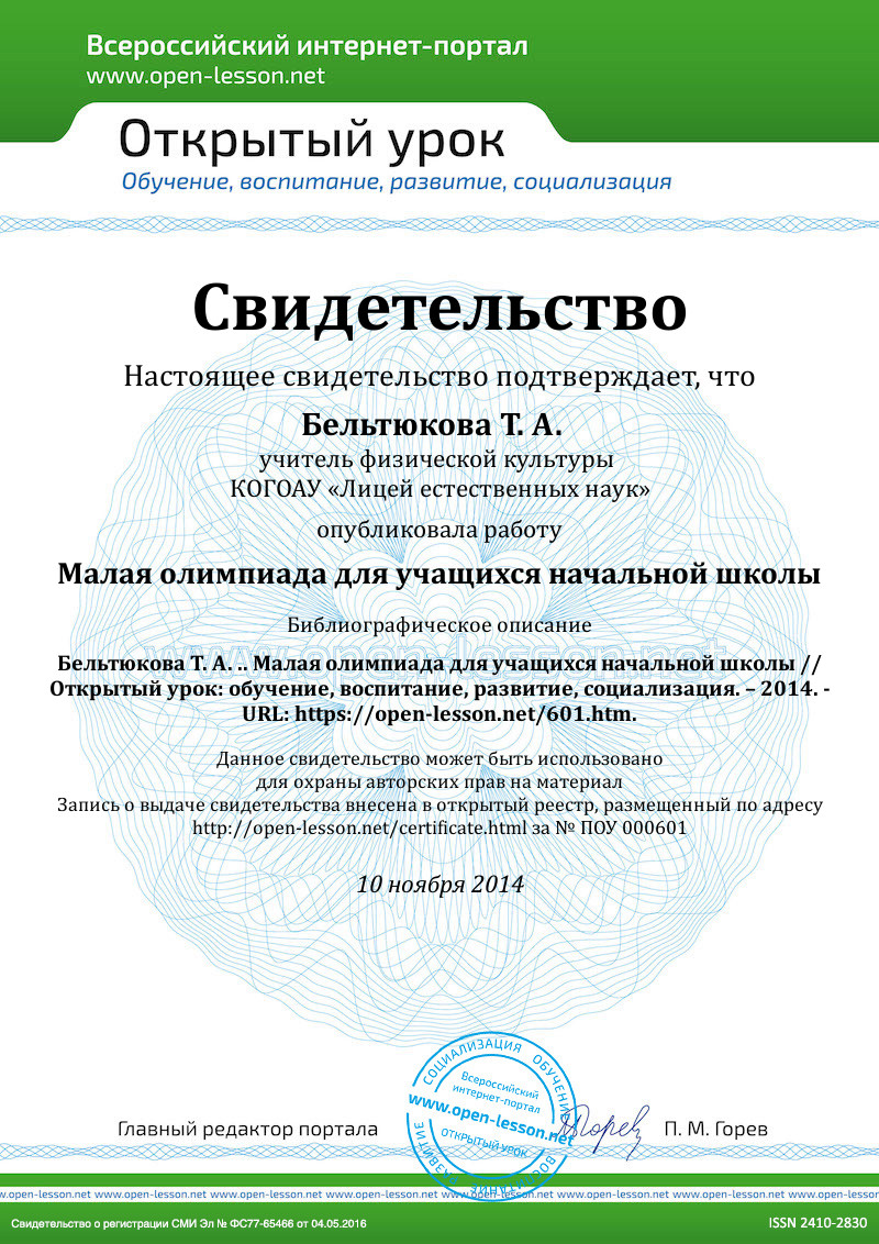 В лицее естественных наук традиционно проводится малая олимпиада, в которой участвуют ученики 1–4-х классов. В программу этих состязаний входят двигательные действия, изученные на уроках и в кружке по общей физической подготовке. Дети готовятся к этому мероприятию заранее: формируют команды, назначают капитана, придумывают название и девиз, готовят приветствие жюри, болельщикам и соперникам. Команды заранее знакомятся с программой, поэтому имеют возможность подготовиться и успешно выступить.