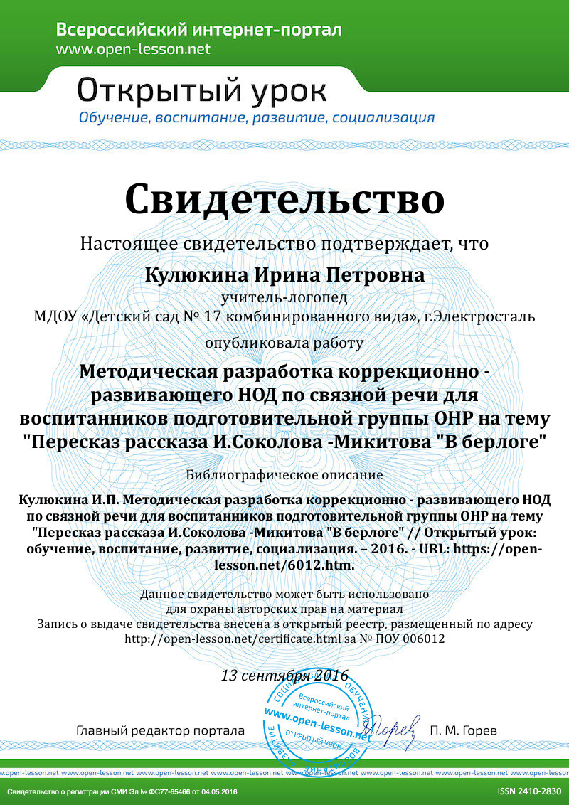 - Текст рассказа И. Соколова – Микитова «В берлоге»;