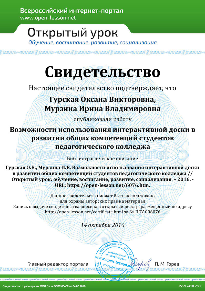 Использование интерактивной доски на учебных занятиях в педагогическом колледже вносит в образовательный процесс новое качество, поскольку не только заметно облегчает подготовку и проведение занятий, но и открывает такие возможности,которые до появления интерактивных досок просто не существовали. Электронные интерактивные доски – это эффективный способ внедрения электронного содержания учебного материала и мультимедийных материалов в процесс обучения. Заранее подготовленные обучающие и проверочные упражнения, красочные иллюстрации различного характера, материал мультимедийных дисков, аудио-, видеоматериалы служат для активизации, повторения или закрепления материала занятия, контроля и самоконтроля знаний. Материал занятия четко вырисовывается на экране интерактивной доски и нацеливает каждого студента к активной плодотворной деятельности. Во время занятия постоянно предоставляется обучающимся возможность самим проделывать некоторые действия, относящиеся к излагаемому материалу. Лучше всего человек запомнит материал, когда увидит, услышит и «потрогает», то есть сам что-то воспроизведет (запишет, нарисует и другое), применит на практике.