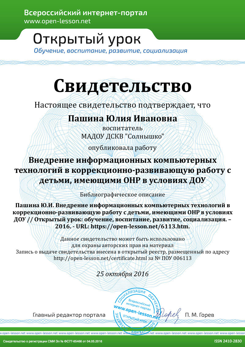 Понимая требования, выдвигаемые современным информационным обществом, я освоила компьютер, программы Word, Excel, Power Point, Outlook, Nero Smart. Совершенствуюсь в области применения информационных технологий. Как и многие педагоги, являюсь участником современных интерактивных проектов. Использование информационно – коммуникационных технологий позволяет мне обобщать свой педагогический опыт работы, размещать конспекты НОД на страницах интернет- сообществ в «Социальных сетях образования педагогических работников» , «13 Всероссийский интернет –педсовет», Maaam.ru.