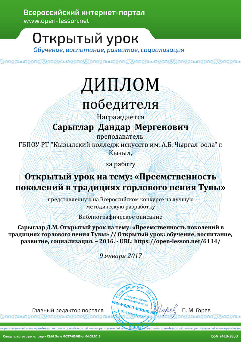 Дорогие зрители, студенты и преподаватели давайте стоя поприветствуем нашего уважаемого гостя представителя четвертого поколения заслуженного артиста РФ и РТ, Народного хоомейжи РТ, Дузун-Хемчикской исполнительской школы, руководителя всемирно известного ансамбля «Хун-Хурту» Ховалыг Кайгал-оола Ким-ооловича!!!