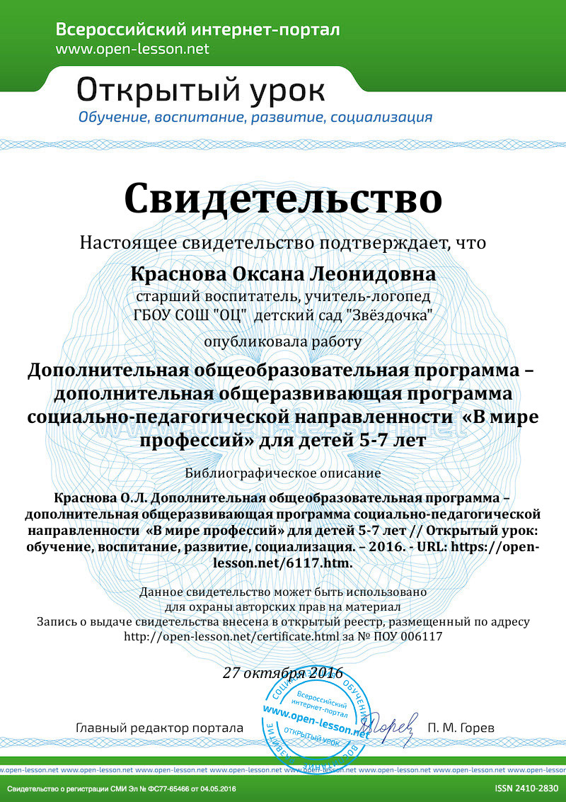 Красновский Л.И. Опыт ранней профориентации / Л.И. Красновский. // Дошкольное воспитание. — 1991. — №10. — С.39—44. |