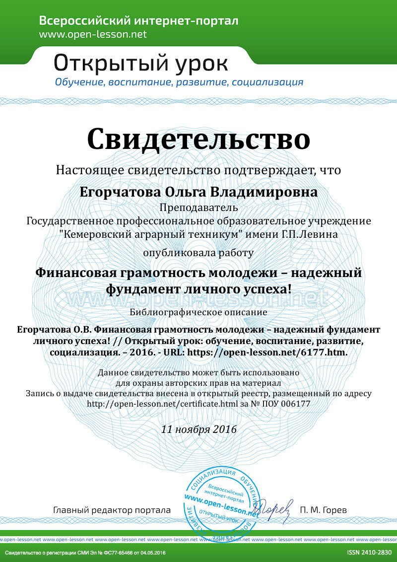 Финансовая грамотность молодежи - надежный фундамент личного успеха! В современном мире молодежь довольно рано сталкивается с финансовыми вопросами и вынуждена принимать решения при формировании личных доходов и осуществлении личных расходов, что делать достаточно проблематично из-за отсутствия необходимой финансовой грамотности. В XIX веке финансовая грамотность стала жизненно необходима, так как это залог финансовой независимости и уверенности в своём будущем. Финансовая грамотность – это достаточный уровень знаний и навыков, который позволяет принимать осознанные и эффективные решения в различных областях управления личными финансами, таких как сбережения, инвестиции, недвижимость, страхование, налоговое и пенсионное планирование и т.д.[2]Грамотный в финансовом плане гражданин не пойдет работать в организацию, которая выдает заработную плату «в конверте», потому что это отразится на пенсионных накопления, по сути, на размере будущей пенсии. Этот гражданин не согласится и на неофициальное трудоустройство, так как он автоматически лишается всего социального пакета: медицинского страхования, отпуска и т.д. Именно финансово грамотный человек всегда себя защитит и обезопасит, он всё обдумает, проанализирует и найдет наиболее правильное решение.В XIX веке отсутствие данного вида грамотности может привести к принятию неразумных финансовых решений, которые могут оказать неблагоприятное воздействие на финансовое состояние человека и даже загнать его в «долговую яму». Совершенно очевидно, что лишь незначительная часть людей умеет заставить деньги работать на себя, а большая часть населения всю жизнь учится работать за деньги. К сожалению, искусству управления финансами не учат в школе, об этом не принято вести систематических разговоров внутри семьи. Данная проблема ни одного поколения и передается от родителей детям, если родители финансово неграмотны, и детям негде получить необходимые знания, умения, представления об эффективном управлении личными финансами. Конечно, многие дети пытаются что-то изменить, но родители не всегда положительно реагируют на эти попытки – получается замкнутый круг.[1] Единственный способ изменить ситуацию, которая сложилась -– постоянно повышать финансовую грамотность населения, начиная со школьного образования.Финансовая грамотность – сложное, многоаспектное понятие, находящееся за пределами определенных географических, политических, экономических и социальных границ. Развитие экономик отдельных стран и мировой экономической системы в целом зависит от инвестиций, которые направляют в них отдельные люди и группы людей; все это образует сложную сеть взаимосвязанных и взаимозависимых отношений, в связи с чем, нельзя недооценивать уровень финансовой грамотности отдельных граждан и ее влияние на развитие мировой экономики в целом.[1]Финансовая некомпетентность граждан пагубно сказывается не только на личном благосостоянии конкретных индивидов из-за неправильного выбора контрагента на финансовом рынке или вида финансовой услуги, неверных решений в области личных финансов или вообще их отсутствия, избегания, пассивной позиции по отношению к личным финансам, но и оказывает мощное негативное влияние на развитие самих финансовых рынков и экономики в целом. Не подготовленн