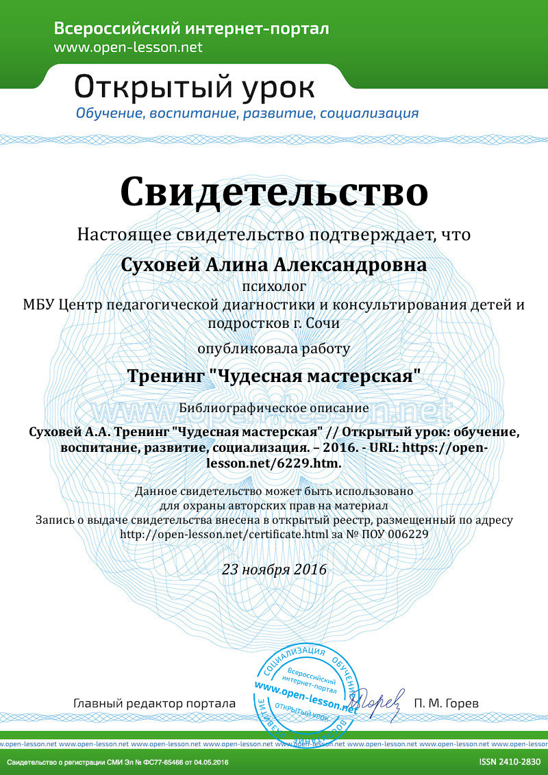 Тренинг прошёл апробацию, был представлен на краевом конкурсе "Педагог-психолог Кубани - 2016" (2 место).