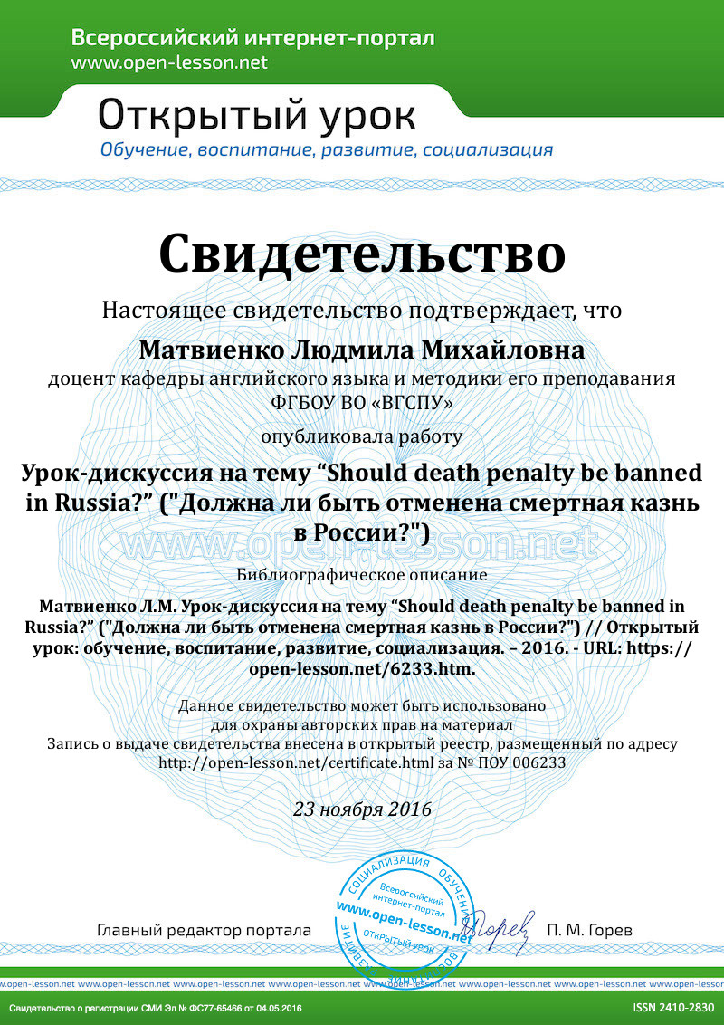 Методическая разработка “Should death penalty be banned in Russia?” является частью целостного процесса обучения «языку для специальных целей» (Language for Special Purposes). Обучение иностранным языкам будущего специалиста в области права предполагает обновление содержания языкового образования с учетом профессионального и личностно-ориентированного подхода, усиление коммуникативной направленности языкового образования, обеспечение дифференциации и индивидуализации в обучении, внедрение современных педагогических технологий, так как в целом ряде профессий владение языком стало необходимой частью профессиональной подготовки. При изучении иностранного языка, будущие специалисты в области права, помимо достаточного объема языковых и страноведческих знаний, приобретают знания юридического характера, правовые убеждения, навыки самообразования, развивают критическое мышление, вырабатывают умение применять на практике полученные правовые знания. В свою очередь, изучение тем и лексики юридического характера, познание особенностей юриспруденции в странах изучаемого языка, в том числе и в сравнении с действующим российским законодательством, позволяет значительно обогатить устную речь учащихся, что порождает дополнительную заинтересованность и положительную мотивацию к изучению иностранного языка. Таким образом, обучение происходит по формуле «Профессия через иностранный язык. Иностранный язык через профессию».