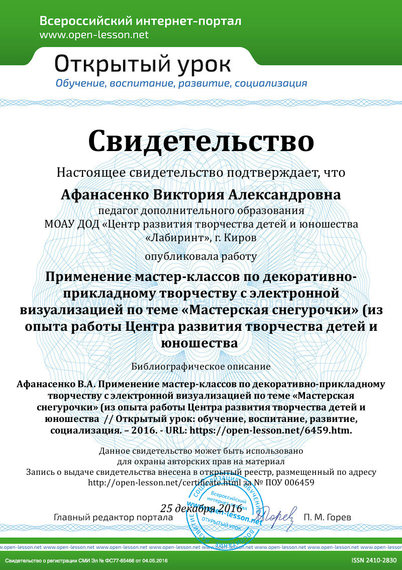 В Центре развития творчества детей и юношества «Лабиринт» города Кирова мастер-классы по декоративно-прикладному творчеству разработаны педагогами и применяются в работе с учащимися детских объединений, родителями воспитанников и педагогами. Чаще всего педагоги разрабатывают визуализацию приемов деятельности в электронной форме, в виде презентаций. В процессе профессиональной деятельности нами было подготовлено учебно-наглядное пособие «Сборник мастер-классов «Мастерская Снегурочки». В нем представлено несколько мастер-классов электронного формата по различным видам декоративно-прикладного творчества: бисероплетение, лепка и роспись, валяние из шерсти, работа с тканью, декупаж.