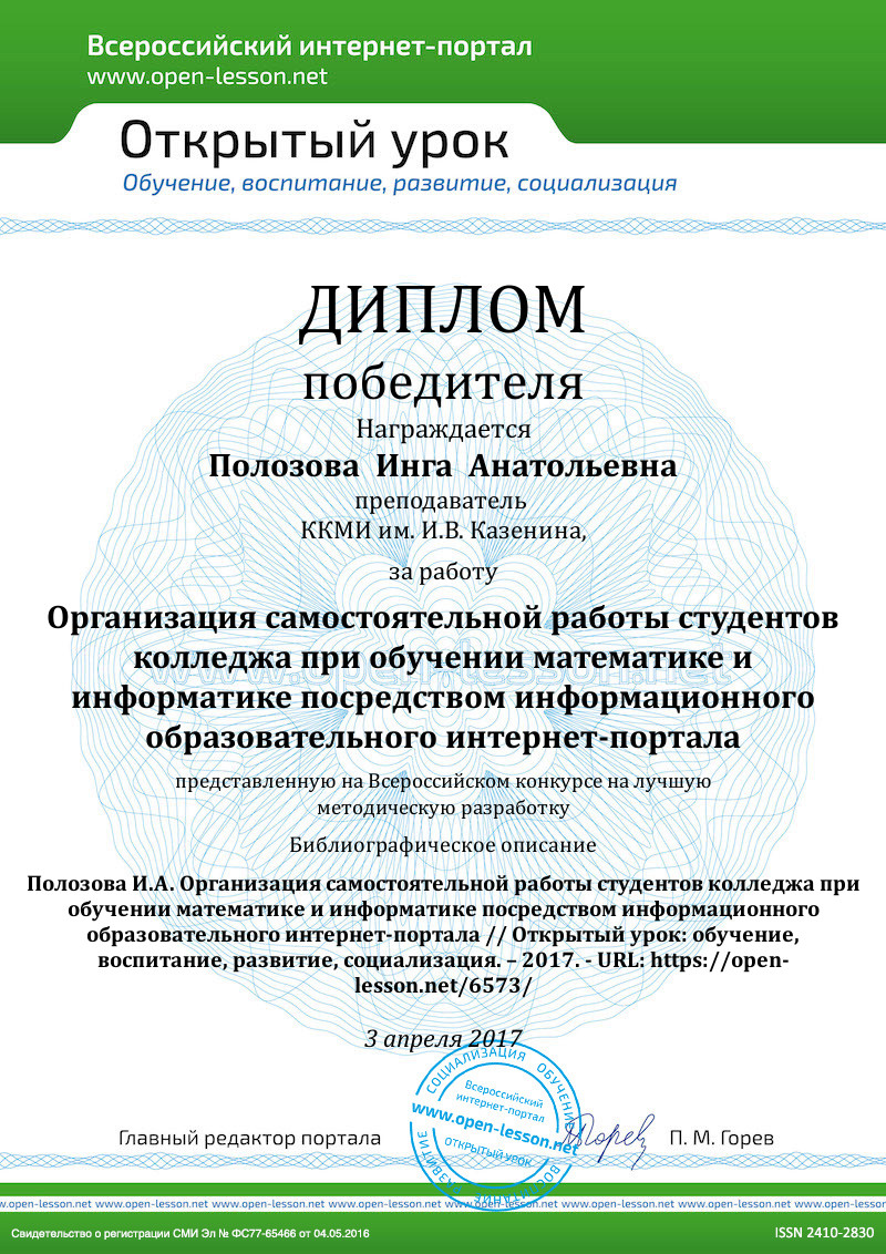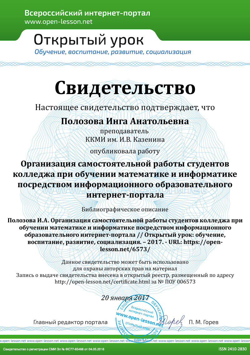 - Полозова И.А, Информационный образовательный интернет-портал по математике / И.А. Полозова // Информационные технологии и прикладная математика: межвузовский сборник аспирантских и студенческих научных работ. Выпуск 6 / отв. ред. Л.В. Широков; Арзамасский филиал ННГУ. – Арзамас: Арзамасский филиал ННГУ, 2016. – 228 с.