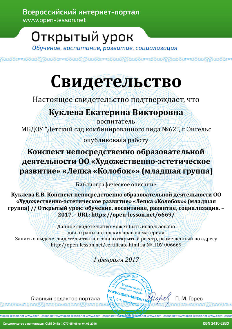 Воспитатель: Правильно, давайте сядем за столы возьмём палочки в руки и подрисуем колобку глазки и ротик. Это следует сделать вот так (Дети выполняют задание по образу). Все слепленные колобки выставляются на стенде.