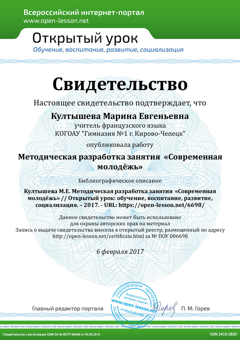 Учитель: У нас начинает вырисовываться образ сегодняшней молодёжи.