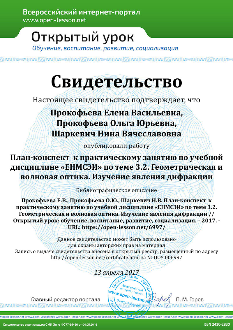 - развивающая – развитие умений по качественному и количественному описанию дифракционной картины, навыков выделения главного, изложения данного материала; развитие внимательности, навыков сравнивать и обобщать факты; умение оценивать свои действия;